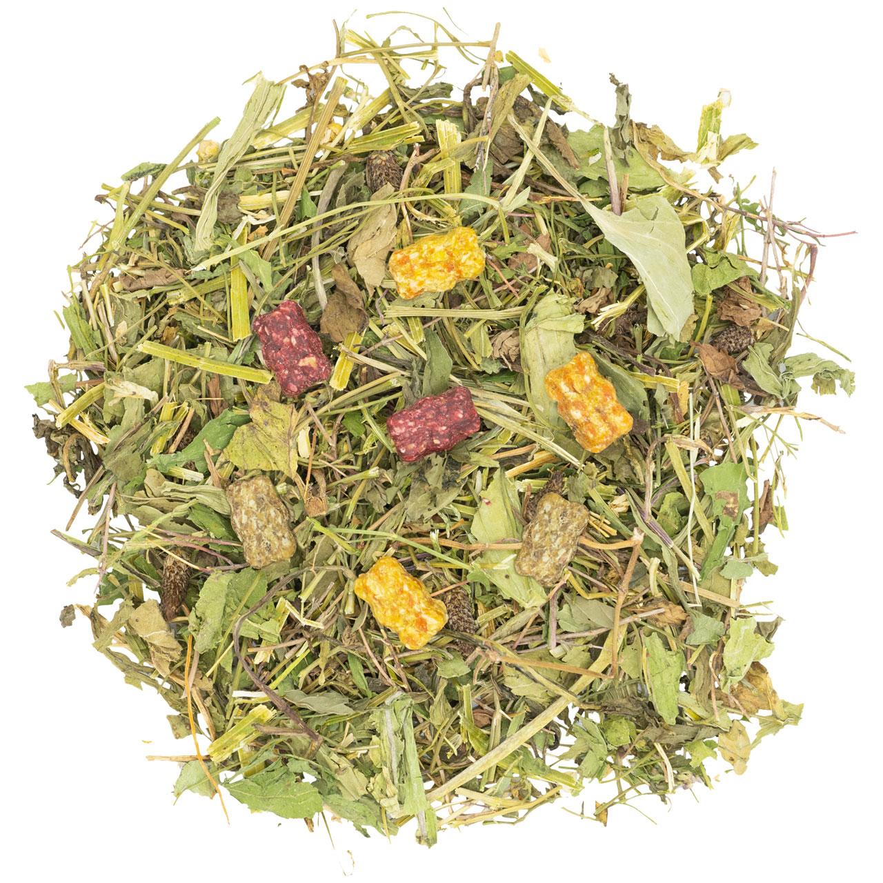 Přirozená zábava při okusování s obzvláště chutnou křupavou bylinnou směsí a aromatickými barevnými medvídky. Doplňkové krmivo pro zakrslé králíky a hlodavce Složení: petržel, pampeliška 20%, hrachové vločky, jitrocel, vojtěška, heřmánek, tymián, máta peprná, mrkev, seno z horské louky, řepkový olej, červená řepa Analytické složky: hr.protein 13%, hr.tuk 2.9%, hr.vláknina 16.9%, hr.popel 9.7%, vápník 8920 mg/kg, fosfor 2790 mg/kg, sodík 1420 mg/kg Krmné doporučení: Smíchejte se senem nebo jinými bylinami nebo přidávejte k denní dávce sena.. Nechte své malé zvíře zažít tuto pochoutku bohatou na bylinky a ponořit se do moře různých chutí. Šetrně sušené bylinky, jako je močopudná petržel a vojtěška, pampeliška povzbuzující metabolismus, křen a tymián odstraňující hleny, máta peprná proti křečím a zklidňující heřmánek, mohou podpořit pohodu vašich malých kožešinových kamarádů mnoha způsoby.