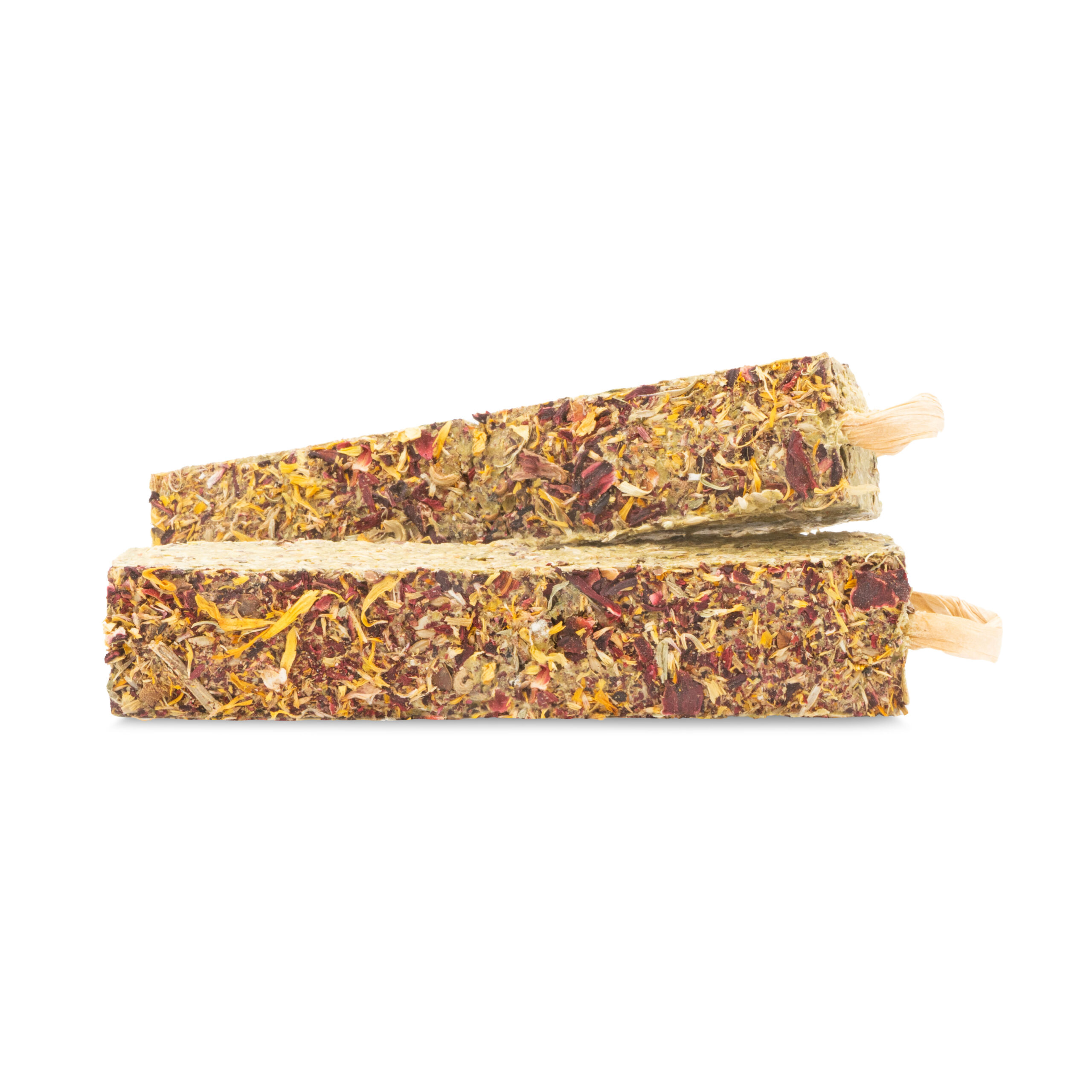 Chutně pečené, bez obilovin a přísad s vysokým obsahem cukru. Zdravá zábava z okusování a dlouhodobá aktivita v jednom. Doplňkové krmivo pro všechny hlodavce a zakrslé králíky Složení: hrachové vločky, lněné semínko, trávová semena, semena lesknice kanárské, řepkový olej, kopřiva, pohanka, květy ibišku 2.9%, petržel, mrkev, konopné semínko, semena fenyklu, máta peprná, pampeliška, semena černuchy seté, květy měsíčku 0.4% Analytické složky: hr.protein 18.3%, hr.tuk 12.1%, hr.vláknina 7.6%, hr.popel 4.2%, vápník 3900 mg/kg, fosfor 3500 mg/kg, sodík 210 mg/kg Krmné doporučení: Podávejte jako pamlsek Zakrslí králíci a malá zvířata milují lahodné a rozmanité Farmys. Bohatě zásobené tyčinky na okusování bez obilí zabaví vaše malé miláčky smysluplně a zaženou nudu z domova každého hlodavce.