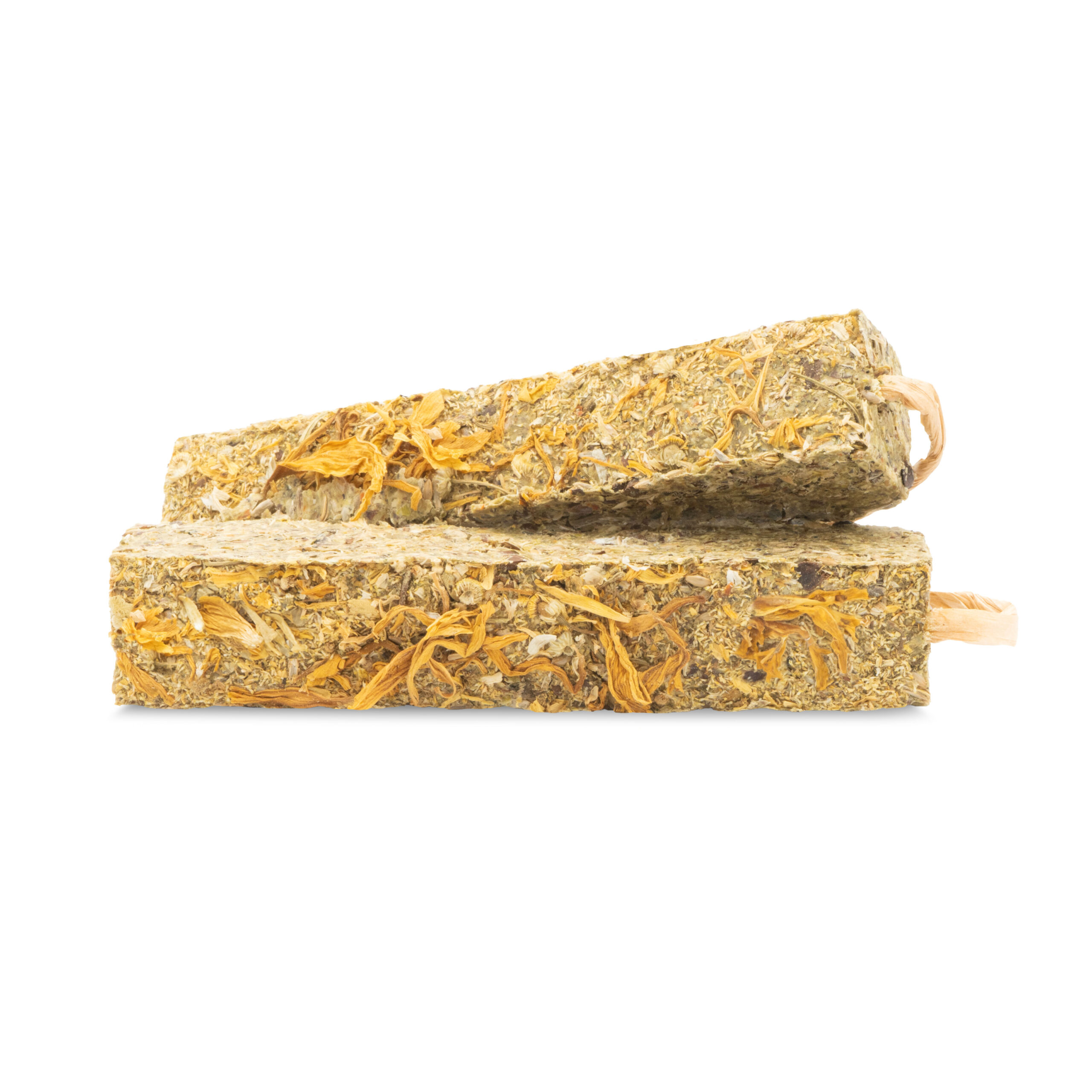 Chutně pečené, bez obilovin a přísad s vysokým obsahem cukru. Zdravá zábava z okusování a dlouhodobá aktivita v jednom. Doplňkové krmivo pro zakrslé králíky a hlodavce Složení: hrachové vločky, lněné semínko, trávová semena, semena lesknice kanárské, kopřiva, řepkový olej, pohanka, petržel, mrkev, konopné semínko, okvětní lístky heřmánku 1.6%, semena fenyklu, máta peprná, pampeliška, semena černuchy seté, okvětní lístky slunečnice 0.7% Analytické složky: hr.protein 17.5%, hr.tuk 12.2%, hr.vláknina 7.6%, hr.popel 4.1%, vápník 3400 mg/kg, fosfor 3550 mg/kg, sodík 230 mg/kg Krmné doporučení: Podávejte jako pamlsek Zakrslí králíci a malá zvířata milují lahodné a rozmanité Farmys. Bohatě zásobené tyčinky na okusování bez obilí zabaví vaše malé miláčky smysluplně a zaženou nudu z domova každého hlodavce.