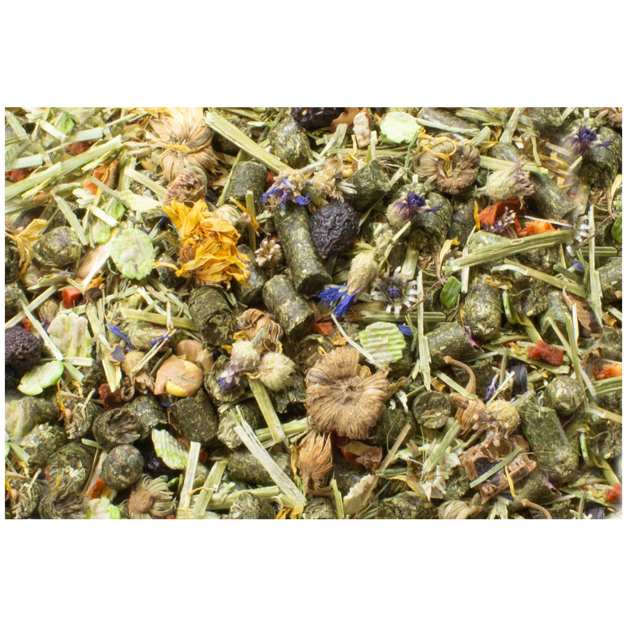 Přírodní kompletní krmná směs vhodná pro činčily. Vysoký obsah vlákniny a receptura bez obilovin podporuje zdravé trávení a brání činčily před nadváhou. Se spoustou zeleniny, vitamínů a minerálů pro zdravý život plný vitality! Kompletní krmivo pro činčily Složení: rostliny z trvalých pastvin v podhůří Alp, hrachové vločky, šípek 5%, fazolové vločky, karob, vojtěška, petržel 3%, květy měsíčku, mrkev, okvětní lístky chrpy, řepkový olej, juka Aditiva/kg: vitamín A 13000 IU,vitamín C 250 mg,vitamín D3 900 IU,vitamín E 80 mg, monohydrát síranu železnatého 65 mg, pentahydrát síranu měďnatého 12.5 mg, oxid manganatý (II) 50 mg, oxid zinečnatý 75 mg, jodičnan vápenatý bezvodý 1.2 mg, seleničitan sodný 0.3 mg, technologické přísady: butylovaný hydroxytoluen 10 mg. Analytické složky: hr.protein 12.6%, hr.tuk 3.3%, hr.vláknina 18.9%, hr.popel 10.9%, vápník 9350 mg/kg, fosfor 3030 mg/kg, sodík 950 mg/kg Krmné doporučení: Misku na krmení doplňujte, až když je téměř prázdná. Dejte prosím denně maximálně tolik jídla, kolik je zcela snědeno za 24 hodin. Široká škála divokých trav a bylin pěstovaných na přírodních loukách v srdci Bavorska je obohacena o hrachové vločky bohaté na bílkoviny, šípky a petržel bohaté na vitamín C, stejně jako mrkev bohatou na vlákninu a vonné květiny.