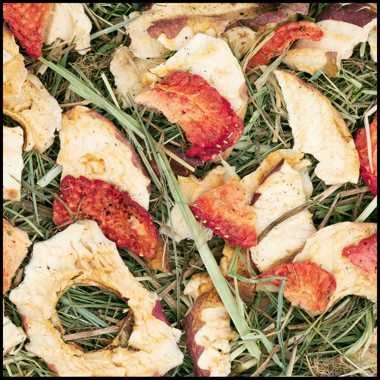 Krabička z přírodního vlákna potažená senem je až po okraj naplněná aromatickým senem z přírodních luk v srdci Bavorska a doplněná chutnou směsí ovoce bohatého na vitamíny. Zve zakrslé králíky a všechna malá zvířata na kulinářský požitek. Všechny komponenty jsou samozřejmě přírodní, a proto je vhodná ke kompletní spotřebě Doplňkové krmivo pro zakrslé králíky a hlodavce Složení: seno z horské louky 46.1%, jablko 27%, lignocelulóza 18%, rostlinný škrob, jahody 2.2% Aditiva/kg: protein 7.6%, fat content 2.4%, crude fibre 25.5%, crude ash 7.3%, calcium 13360 mg/kg, phosphorus 1550 mg/kg, sodium 500 mg/kg Krmné doporučení: Vyměňte dle potřeby Seno slouží jako nutriční základ pro zakrslé králíky a malá zvířata. Jeho vysoký obsah surové vlákniny podporuje důležitý otěr zubů při okusování a zároveň příznivě ovlivňuje trávení zvířat. Chutná ovocná směs jablka bohatého na vlákninu a jahod bohatých na životně důležité látky promění tácek na seno v ovocnou, jemnou a zdravou pochoutku.