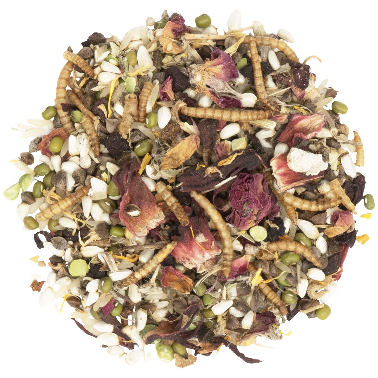 Spojení na bílkoviny bohatých moučných červů s vybranými semeny, luštěninami a květy – výživná pochoutka pro malá zvířata Doplňkové krmivo pro křečky, potkany, myši a další všežravé hlodavce Složení: pohanka, saflor, rýže 15 %, mungo fazole, loupaný sezam, červená řepa, hrách, květy ibišku, okvětní lístky růže 3 %, mouční červi 3 %, ostropestřec mariánský, květy měsíčku Aditiva/kg: vápník 2410 mg/kg, fosfor 3220 mg/kg, sodík 630 mg/kg Analytické složky: hrubý protein 15,1 %, hrubý tuk 12,4 %, hrubá vláknina 12,7 %, hrubý popel 3,4 % Krmné doporučení: Podávejte jako pamlsek